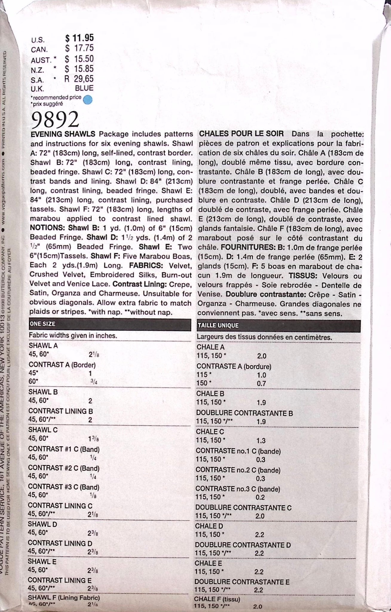 Misses' Shawls: Add a touch of vintage elegance to your wardrobe with Vogue 9892. This sewing pattern includes instructions for creating stunning evening shawls for a glamorous night out. Perfect for adding a unique touch to any outfit, these shawls are sure to turn heads. ©1998.