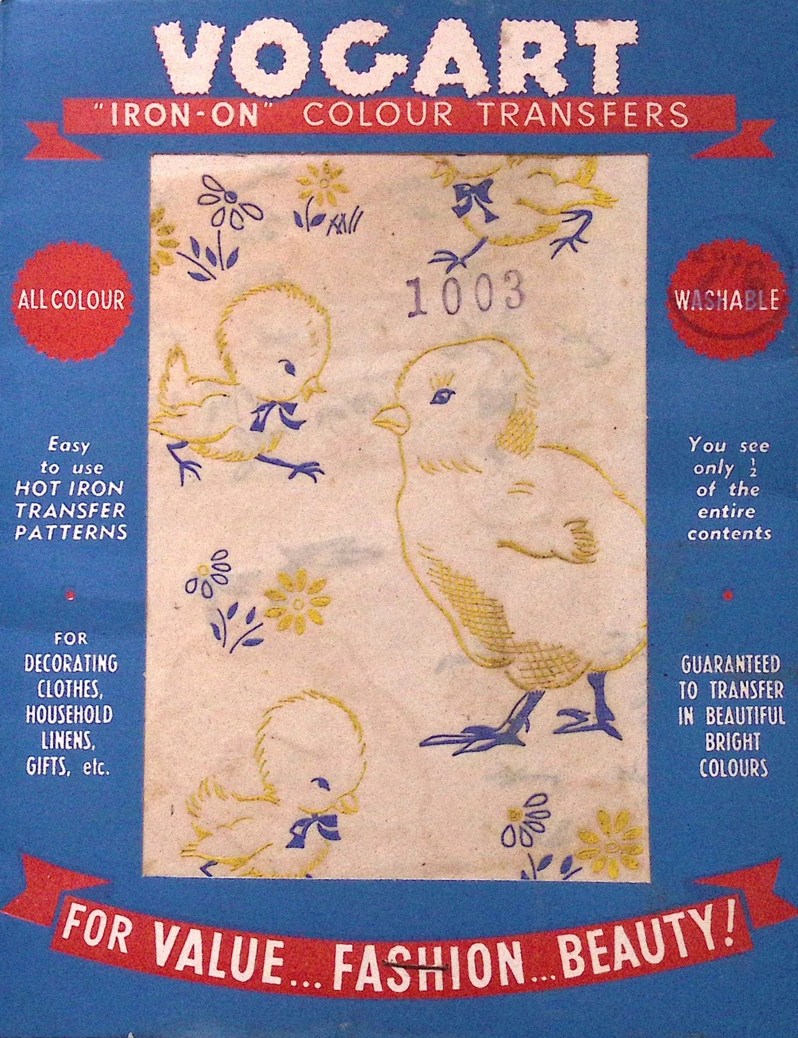 Add a touch of whimsy to any project with these Vintage Vogart Iron-On Colourful Transfers! These playful and vibrant transfers feature adorable baby chicks in shimmering gold and regal royal blue, sure to bring a smile to anyone's face. Perfect for adding a unique and playful touch to any fabric or crafting project. ©1950's.